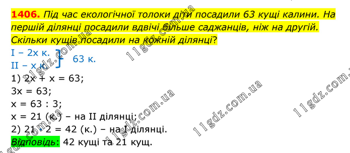 Під час екологічної толоки діти посадили 63 кущі калини. На першій ділянці посадили вдвічі більше саджанців, ніж на другій. Скільки кущів посадили на кожній ділянці? І – 2х к. ІІ – х к. 1) 2х + х = 63; 3х = 63; х = 63 : 3; х = 21 (к.) – на ІІ ділянці; 2) 21 · 2 = 42 (к.) – на І ділянці. Відповідь: 42 кущі та 21 кущ.