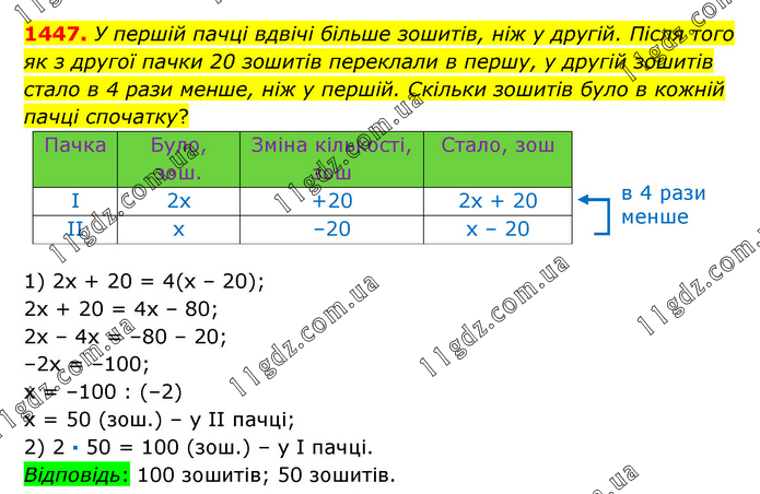 У першій пачці вдвічі більше зошитів, ніж у другій. Після того як з другої пачки 20 зошитів переклали в першу, у другій зошитів стало в 4 рази менше, ніж у першій. Скільки зошитів було в кожній пачці спочатку? 1) 2х + 20 = 4(х – 20); 2х + 20 = 4х – 80; 2х – 4х = –80 – 20; –2х = –100; х = –100 : (–2) х = 50 (зош.) – у ІІ пачці; 2) 2 · 50 = 100 (зош.) – у І пачці. Відповідь: 100 зошитів; 50 зошитів.