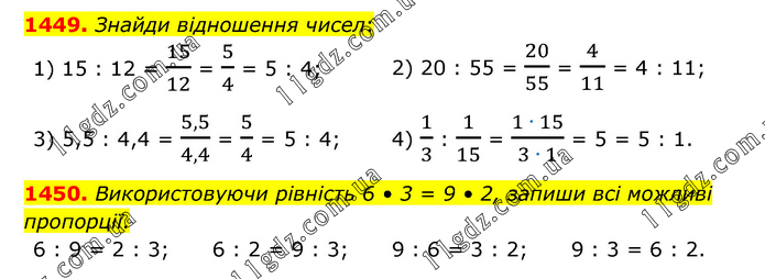 Знайди відношення чисел: 1) 15 : 12 = 15/12 = 5/4 = 5 : 4; 2) 20 : 55 = 20/55 = 4/11 = 4 : 11; 3) 5,5 : 4,4 = 5,5/4,4 = 5/4 = 5 : 4; 4) 1/3 : 1/15 = (1 ∙ 15)/(3 ∙ 1) = 5 = 5 : 1. 1450. Використовуючи рівність 6 • 3 = 9 • 2, запиши всі можливі пропорції. 6 : 9 = 2 : 3; 6 : 2 = 9 : 3; 9 : 6 = 3 : 2; 9 : 3 = 6 : 2.