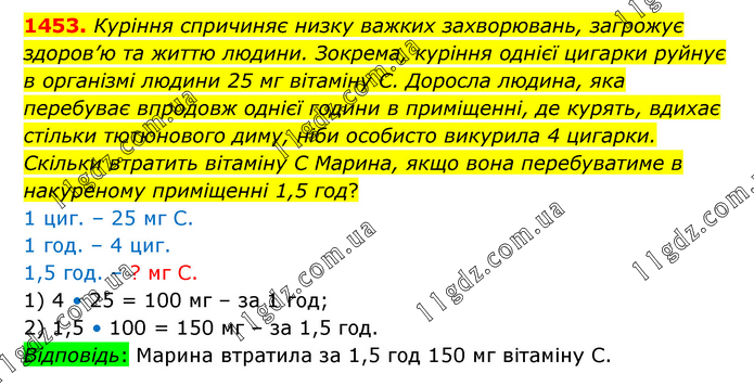 Куріння спричиняє низку важких захворювань, загрожує здоров’ю та життю людини. Зокрема, куріння однієї цигарки руйнує в організмі людини 25 мг вітаміну С. Доросла людина, яка перебуває впродовж однієї години в приміщенні, де курять, вдихає стільки тютюнового диму, ніби особисто викурила 4 цигарки. Скільки втратить вітаміну C Марина, якщо вона перебуватиме в накуреному приміщенні 1,5 год? 1 циг. – 25 мг С. 1 год. – 4 циг. 1,5 год. – ? мг С. 1) 4 • 25 = 100 мг – за 1 год; 2) 1,5 • 100 = 150 мг – за 1,5 год. Відповідь: Марина втратила за 1,5 год 150 мг вітаміну С.