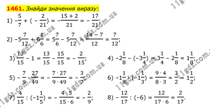 Знайди значення виразу: 1) –5/7 + ( – 2/21) = –(15 + 2)/21 = – 17/21; 2) –57/12 + 61/6 = 57/6 – 57/12 = (14 - 7)/12 = 7/12; 3) 13/15 – 1 = 13/15 – 15/15 = – 2/15; 4) –21/8 – (–31/4) = 31/4 – 21/8 = 11/8; 5) – 7/9 · 27/49 = – (7 ∙ 27)/(9 ∙ 49) = – 3/7; 6) –11/8 · (–11/3) = (9 ∙ 4)/(8 ∙ 3) = 3/2 = 11/2; 7) 4/15 : (–11/5) = – (4 ∙ 5)/(15 ∙ 6) = – 2/9; 8) – 12/17 : (–6) = 12/(17 ∙ 6) = 2/17.
