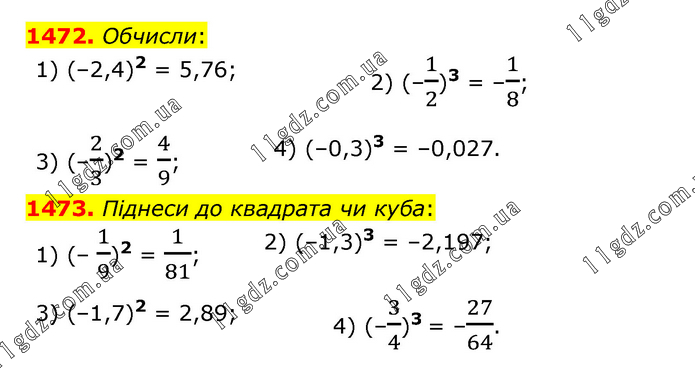 1472. Обчисли: 1) (–2,4)2 = 5,76; 2) (–1/2)3 = –1/8; 3) (–2/3)2 = 4/9; 4) (–0,3)3 = –0,027. 1473. Піднеси до квадрата чи куба: 1) (– 1/9)2 = 1/81; 2) (–1,3)3 = –2,197; 3) (–1,7)2 = 2,89; 4) (–3/4)3 = –27/64.