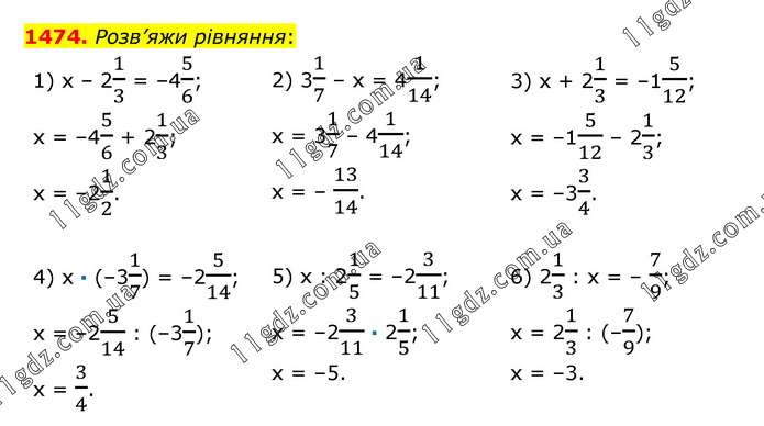 Розв’яжи рівняння: 1) х – 21/3 = –45/6; х = –45/6 + 21/3; х = –21/2. 2) 31/7 – х = 41/14; х = 31/7 – 41/14; х = – 13/14. 3) х + 21/3 = –15/12; х = –15/12 – 21/3; х = –33/4. 4) х · (–31/7) = –25/14; х = –25/14 : (–31/7); х = 3/4. 5) х : 21/5 = –23/11; х = –23/11 · 21/5; х = –5. 6) 21/3 : х = – 7/9; х = 21/3 : (–7/9); х = –3.