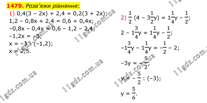 Розв’яжи рівняння: 1) 0,4(3 – 2х) + 2,4 = 0,2(3 + 2х); 1,2 – 0,8х + 2,4 = 0,6 + 0,4х; –0,8х – 0,4х = 0,6 – 1,2 – 2,4; –1,2х = –3; х = –3 : (–1,2); х = 2,5. 2) 1/2 (4 – 31/2у) = 11/4у – 1/2; 2 – 13/4у = 11/4у – 1/2; –13/4у – 11/4у = –1/2 – 2; –3у = – 5/2; у = – 5/2 : (–3); у = 5/6.