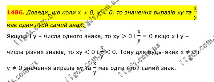 Доведи, що коли х ≠ 0, у ≠ 0, то значення виразів ху та х/у має один і той самий знак. Якщо х і у – числа одного знака, то ху > 0 і х/у = 0 якщо х і у – числа різних знаків, то ху < 0 і х/у < 0. Тому для будь–яких х ≠ 0 і у ≠ 0 значення виразів ху та х/у має один і той самий знак.