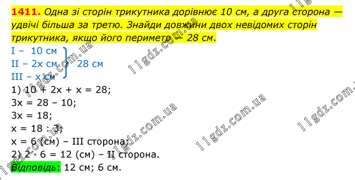 Одна зі сторін трикутника дорівнює 10 см, а друга сторона — удвічі більша за третю. Знайди довжини двох невідомих сторін трикутника, якщо його периметр — 28 см. І – 10 см ІІ – 2х см 28 см ІІІ – х см 1) 10 + 2х + х = 28; 3х = 28 – 10; 3х = 18; х = 18 : 3; х = 6 (см) – ІІІ сторона; 2) 2 · 6 = 12 (см) – ІІ сторона. Відповідь: 12 см; 6 см.