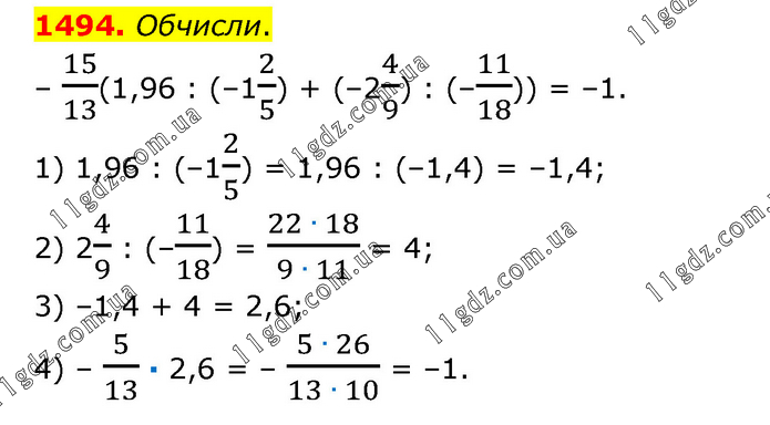 Обчисли. – 15/13(1,96 : (–12/5) + (–24/9) : (–11/18)) = –1. 1) 1,96 : (–12/5) = 1,96 : (–1,4) = –1,4; 2) 24/9 : (–11/18) = (22 ∙ 18)/(9 ∙ 11) = 4; 3) –1,4 + 4 = 2,6; 4) – 5/13 · 2,6 = – (5 ∙ 26)/(13 ∙ 10) = –1.