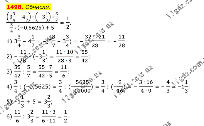 Обчисли. ((3 3/4 - 4 1/7) ∙ (-3 1/3) ∶ 5/7)/(3/4 ∶ (-0,5625) + 5) = 1/2. 1) 33/4 – 41/7 = –(38/7 – 33/4) = – (32 - 21)/28 = – 11/28 2) – 11/(28 ) · (–31/3) = (11 ∙ 10)/(28 ∙ 3) = 55/42; 3) 55/42 : 5/7 = (55 ∙ 7)/(42 ∙ 5) = 11/6; 4) 3/4 : (–0,5625) = 3/4 : (–5625/10000) = 3/4 : (–9/16) = – (3 ∙ 16)/(4 ∙ 9) = – 4/3 = –11/3; 5) –11/3 + 5 = 32/3; 6) 11/6 : 32/3 = (11 ∙ 3)/(6 ∙ 11) = 1/2.