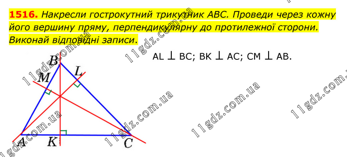 Накресли гострокутний трикутник ABC. Проведи через кожну його вершину пряму, перпендикулярну до протилежної сторони. Виконай відповідні записи. AL ⊥ BC; BK ⊥ AC; CM ⊥ AB.