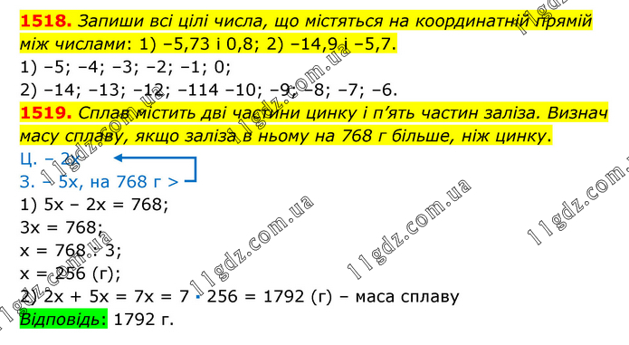 1518. Запиши всі цілі числа, що містяться на координатній прямій між числами: 1) –5,73 і 0,8; 2) –14,9 і –5,7. 1) –5; –4; –3; –2; –1; 0; 2) –14; –13; –12; –114 –10; –9; –8; –7; –6. 1519. Сплав містить дві частини цинку і п’ять частин заліза. Визнач масу сплаву, якщо заліза в ньому на 768 г більше, ніж цинку. Ц. – 2х З. – 5х, на 768 г > 1) 5х – 2х = 768; 3х = 768; х = 768 : 3; х = 256 (г); 2) 2х + 5х = 7х = 7 · 256 = 1792 (г) – маса сплаву Відповідь: 1792 г.