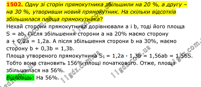 Одну зі сторін прямокутника збільшили на 20 %, а другу – на 30 %, утворивши новий прямокутник. На скільки відсотків збільшилася площа прямокутника? Нехай сторони прямокутника дорівнювали а і b, тоді його площа S = ab. Після збільшення сторони а на 20% маємо сторону а + 0,2а = 1,2а. А після збільшення сторони b на 30%, маємо сторону b + 0,3b = 1,3b. Площа утвореного прямокутника S1 = 1,2а · 1,3b = 1,56аb = 1,56S. Тобто вона становить 156% площі початкового. Отже, площа збільшилася на 56%. Відповідь: На 56%.