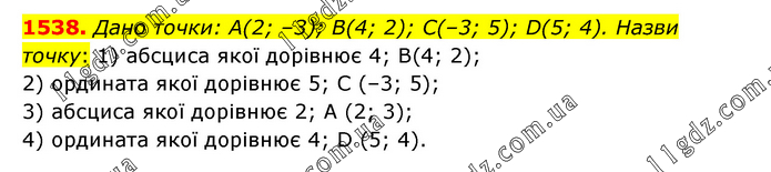Дано точки: А(2; –3); В(4; 2); С(–3; 5); D(5; 4). Назви точку: 1) абсциса якої дорівнює 4; B(4; 2); 2) ордината якої дорівнює 5; C (–3; 5); 3) абсциса якої дорівнює 2; A (2; 3); 4) ордината якої дорівнює 4; D (5; 4).
