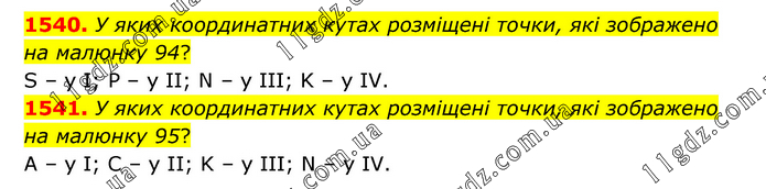 1540. У яких координатних кутах розміщені точки, які зображено на малюнку 94? S – y I; P – y II; N – y III; K – y IV. 1541. У яких координатних кутах розміщені точки, які зображено на малюнку 95? A – y I; C – y II; K – y III; N – y IV.