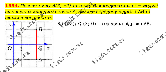 Познач точку А(3; –2) та точку B, координати якої — модулі відповідних координат точки А. Знайди середину відрізка AB та вкажи її координати. В (3; 2); Q (3; 0) – середина відрізка АВ.