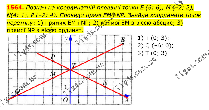 Познач на координатній площині точки Е (6; 6), М (–2; 2), N(4; 1), Р (–2; 4). Проведи прямі EM і NP. Знайди координати точок перетину: 1) прямих EM і NP; 2) прямої EM з віссю абсцис; 3) прямої NP з віссю ординат. 1) T (0; 3); 2) Q (–6; 0); 3) T (0; 3).