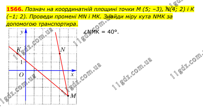 Познач на координатній площині точки М (5; –3), N(4; 2) і К (–1; 2). Проведи промені MN і MK. Знайди міру кута NMK за допомогою транспортира. ∠NMK = 40°.