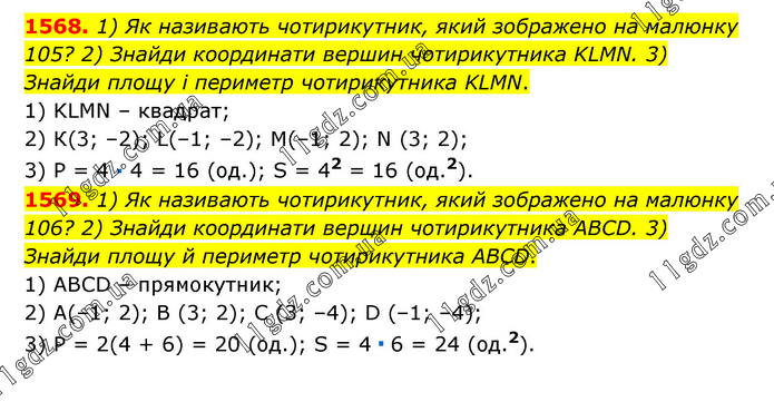 1568. 1) Як називають чотирикутник, який зображено на малюнку 105? 2) Знайди координати вершин чотирикутника KLMN. 3) Знайди площу і периметр чотирикутника KLMN. 1) KLMN – квадрат; 2) К(3; –2); L(–1; –2); М(–1; 2); N (3; 2); 3) Р = 4 · 4 = 16 (од.); S = 42 = 16 (од.2). 1569. 1) Як називають чотирикутник, який зображено на малюнку 106? 2) Знайди координати вершин чотирикутника ABCD. 3) Знайди площу й периметр чотирикутника ABCD. 1) АВСD – прямокутник; 2) А(–1; 2); В (3; 2); С (3; –4); D (–1; –4); 3) Р = 2(4 + 6) = 20 (од.); S = 4 · 6 = 24 (од.2).