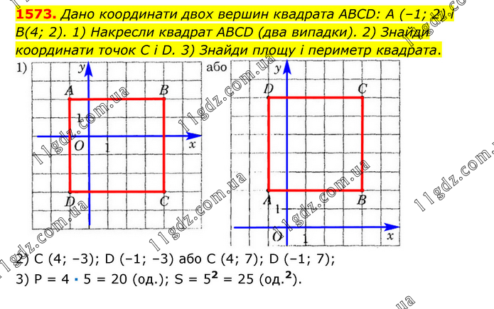 Дано координати двох вершин квадрата ABCD: А (–1; 2) і В(4; 2). 1) Накресли квадрат ABCD (два випадки). 2) Знайди координати точок C i D. 3) Знайди площу і периметр квадрата. 2) С (4; –3); D (–1; –3) або С (4; 7); D (–1; 7); 3) Р = 4 · 5 = 20 (од.); S = 52 = 25 (од.2).
