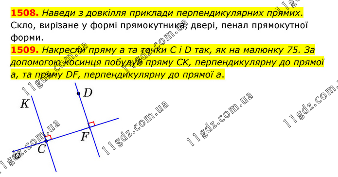 1508. Наведи з довкілля приклади перпендикулярних прямих. Скло, вирізане у формі прямокутника, двері, пенал прямокутної форми. 1509. Накресли пряму а та точки C і D так, як на малюнку 75. За допомогою косинця побудуй пряму CK, перпендикулярну до прямої а, та пряму DF, перпендикулярну до прямої а.