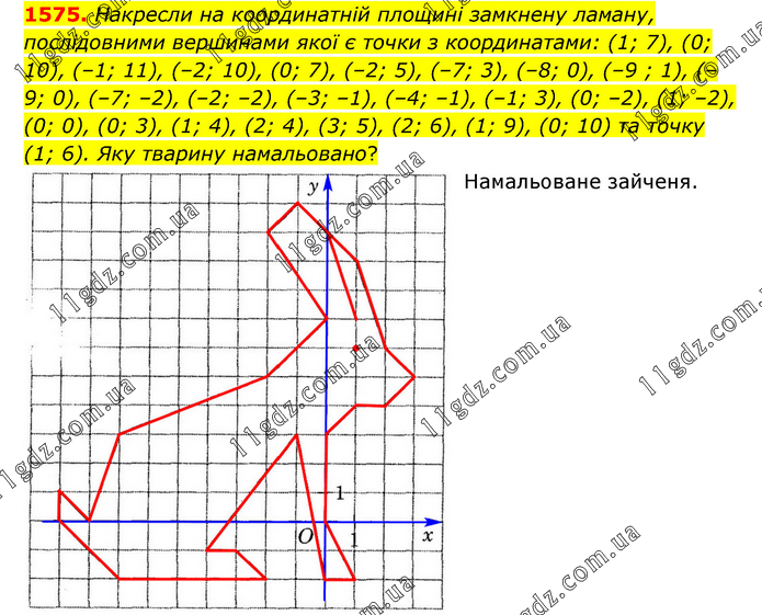 Накресли на координатній площині замкнену ламану, послідовними вершинами якої є точки з координатами: (1; 7), (0; 10), (–1; 11), (–2; 10), (0; 7), (–2; 5), (–7; 3), (–8; 0), (–9 ; 1), (–9; 0), (–7; –2), (–2; –2), (–3; –1), (–4; –1), (–1; 3), (0; –2), (1; –2), (0; 0), (0; 3), (1; 4), (2; 4), (3; 5), (2; 6), (1; 9), (0; 10) та точку (1; 6). Яку тварину намальовано? Намальоване зайченя.