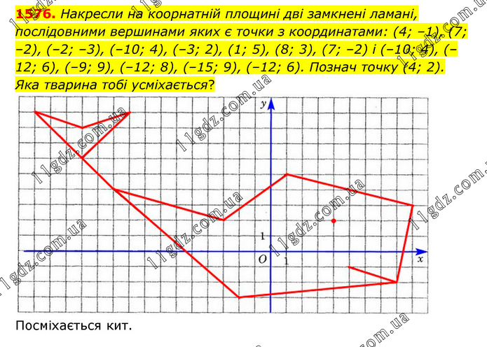 Накресли на коорнатній площині дві замкнені ламані, послідовними вершинами яких є точки з координатами: (4; –1), (7; –2), (–2; –3), (–10; 4), (–3; 2), (1; 5), (8; 3), (7; –2) і (–10; 4), (–12; 6), (–9; 9), (–12; 8), (–15; 9), (–12; 6). Познач точку (4; 2). Яка тварина тобі усміхається? Посміхається кит.