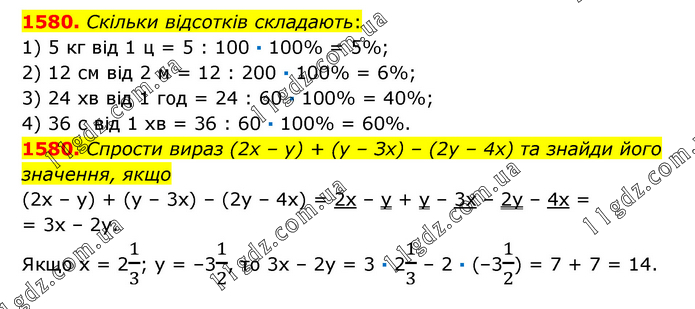 1580. Скільки відсотків складають: 1) 5 кг від 1 ц = 5 : 100 · 100% = 5%; 2) 12 см від 2 м = 12 : 200 · 100% = 6%; 3) 24 хв від 1 год = 24 : 60 · 100% = 40%; 4) 36 с від 1 хв = 36 : 60 · 100% = 60%. 1580. Спрости вираз (2х – у) + (у – Зх) – (2у – 4х) та знайди його значення, якщо (2х – у) + (у – 3х) – (2у – 4х) = 2х – у + у – 3х – 2у – 4х = = 3х – 2у. Якщо х = 21/3; у = –31/2, то 3х – 2у = 3 · 21/3 – 2 · (–31/2) = 7 + 7 = 14.
