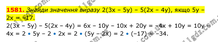 Знайди значення виразу 2(3х – 5у) – 5(2х – 4у), якщо 5у – 2х = –17. 2(3х – 5у) – 5(2х – 4у) = 6x – 10у – 10х + 20у = –4x + 10у = 10у – 4x = 2 • 5у – 2 • 2х = 2 • (5у – 2х) = 2 • (–17) = –34.