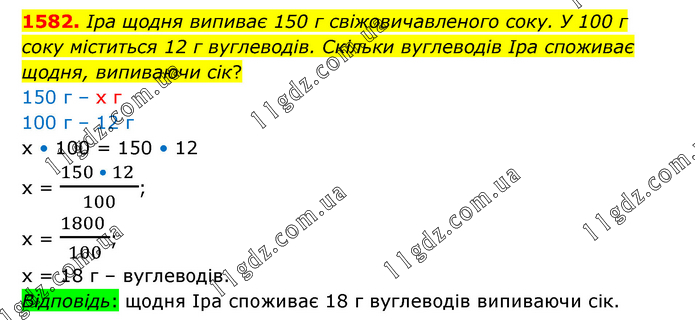Ipa щодня випиває 150 г свіжовичавленого соку. У 100 г соку міститься 12 г вуглеводів. Скільки вуглеводів Ipa споживає щодня, випиваючи сік? 150 г – х г 100 г – 12 г х • 100 = 150 • 12 х = (150 • 12 )/100; х = (1800 )/100; х = 18 г – вуглеводів. Відповідь: щодня Іра споживає 18 г вуглеводів випиваючи сік.