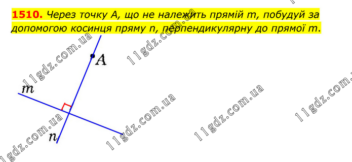 Через точку А, що не належить прямій m, побудуй за допомогою косинця пряму n, перпендикулярну до прямої m.