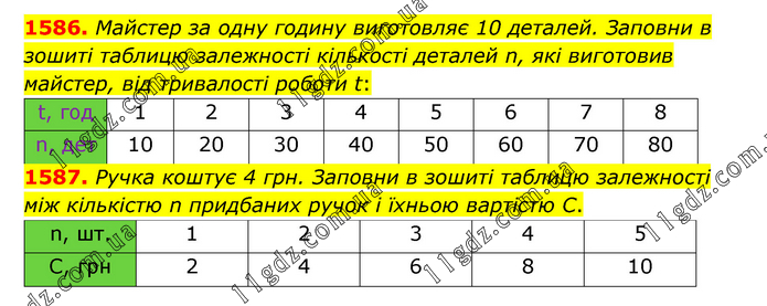 1586. Майстер за одну годину виготовляє 10 деталей. Заповни в зошиті таблицю залежності кількості деталей n, які виготовив майстер, від тривалості роботи t: 1587. Ручка коштує 4 грн. Заповни в зошиті таблицю залежності між кількістю n придбаних ручок і їхньою вартістю С.