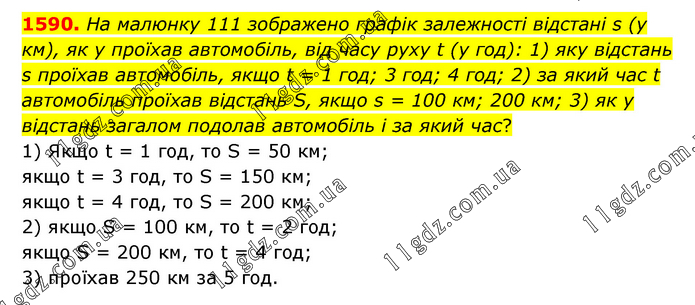 На малюнку 111 зображено графік залежності відстані s (у км), як у проїхав автомобіль, від часу руху t (у год): 1) яку відстань s проїхав автомобіль, якщо t = 1 год; 3 год; 4 год; 2) за який час t автомобіль проїхав відстань S, якщо s = 100 км; 200 км; 3) як у відстань загалом подолав автомобіль і за який час? 1) Якщо t = 1 год, то S = 50 км; якщо t = 3 год, то S = 150 км; якщо t = 4 год, то S = 200 км; 2) якщо S = 100 км, то t = 2 год; якщо S = 200 км, то t = 4 год; 3) проїхав 250 км за 5 год.