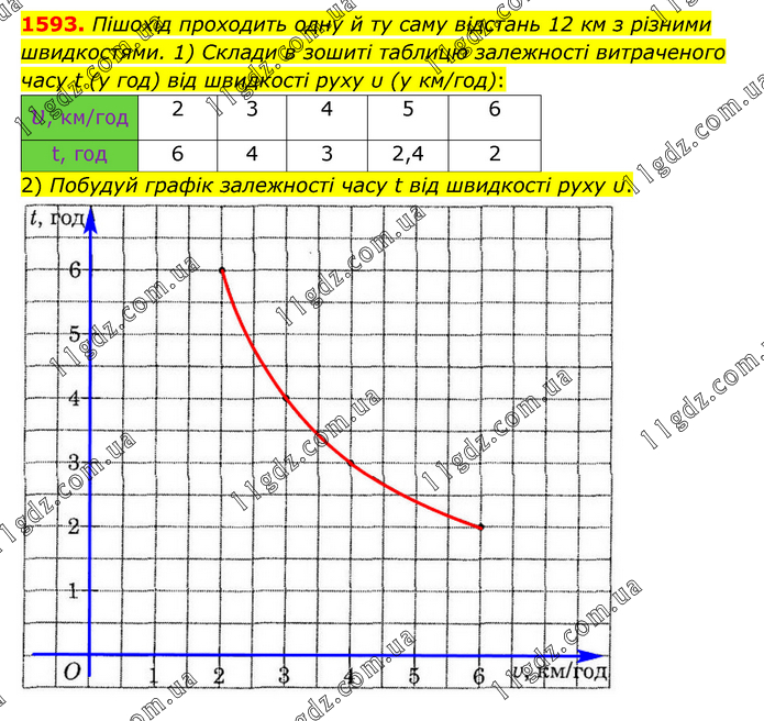 1593. Пішохід проходить одну й ту саму відстань 12 км з різними швидкостями. 1) Склади в зошиті таблицю залежності витраченого часу t (у год) від швидкості руху υ (у км/год): 2) Побудуй графік залежності часу t від швидкості руху υ.