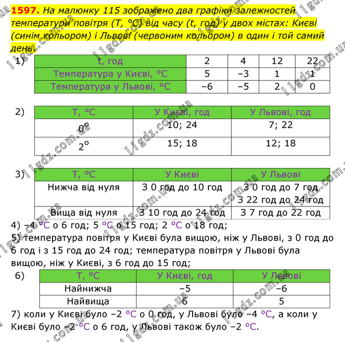 На малюнку 115 зображено два графіки залежностей температури повітря (Т, °С) від часу (t, год) у двох містах: Києві (синім кольором) і Львові (червоним кольором) в один і той самий день. 4) –4 °С о 6 год; 5 °С о 15 год; 2 °С о 18 год; 5) температура повітря у Києві була вищою, ніж у Львові, з 0 год до 6 год і з 15 год до 24 год; температура повітря у Львові була вищою, ніж у Києві, з 6 год до 15 год; 7) коли у Києві було –2 °С о 0 год, у Львові було –4 °С, а коли у Києві було –2 °С о 6 год, у Львові також було –2 °С.