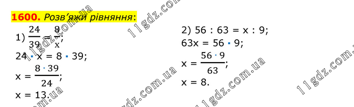 Розв’яжи рівняння: 1) 24/39 = 8/х; 24 · х = 8 · 39; х = (8 ∙ 39)/24; х = 13. 2) 56 : 63 = х : 9; 63х = 56 · 9; х = (56 ∙ 9)/63; х = 8.