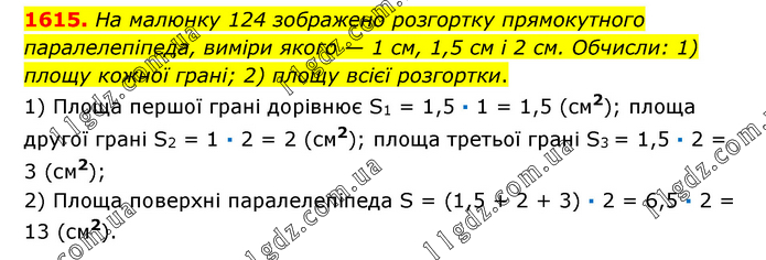 На малюнку 124 зображено розгортку прямокутного паралелепіпеда, виміри якого — 1 см, 1,5 см і 2 см. Обчисли: 1) площу кожної грані; 2) площу всієї розгортки. 1) Площа першої грані дорівнює S1 = 1,5 ∙ 1 = 1,5 (см2); площа другої грані S2 = 1 ∙ 2 = 2 (см2); площа третьої грані S3 = 1,5 ∙ 2 = 3 (см2); 2) Площа поверхні паралелепіпеда S = (1,5 + 2 + 3) ∙ 2 = 6,5 ∙ 2 = 13 (см2).