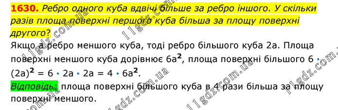 Ребро одного куба вдвічі більше за ребро іншого. У скільки разів площа поверхні першого куба більша за площу поверхні другого? Якщо а ребро меншого куба, тоді ребро більшого куба 2а. Площа поверхні меншого куба дорівнює 6а2, площа поверхні більшого 6 ∙ (2а)2 = 6 ∙ 2а ∙ 2а = 4 ∙ 6а2. Відповідь: площа поверхні більшого куба в 4 рази більша за площу поверхні меншого.