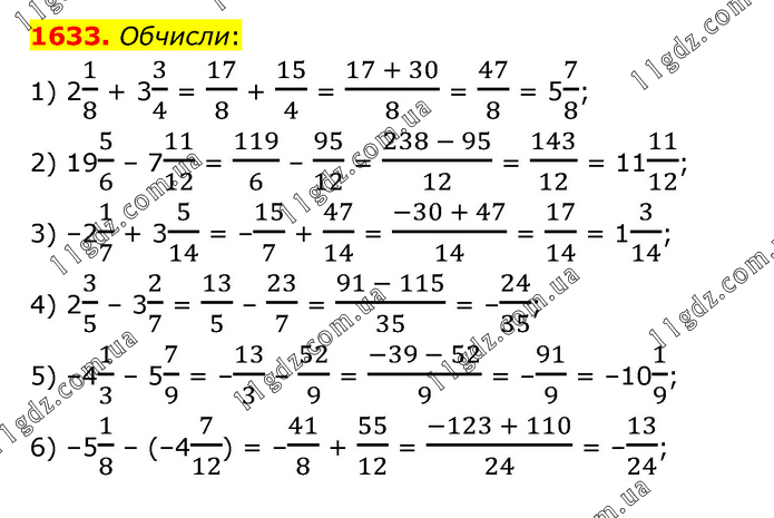 Обчисли: 1) 21/8 + 33/4 = 17/8 + 15/4 = (17 + 30)/8 = 47/8 = 57/8; 2) 195/6 – 711/12 = 119/6 – 95/12 = (238 - 95)/12 = 143/12 = 1111/12; 3) –21/7 + 35/14 = –15/7 + 47/14 = (-30 + 47)/14 = 17/14 = 13/14; 4) 23/5 – 32/7 = 13/5 – 23/7 = (91 - 115)/35 = –24/35; 5) –41/3 – 57/9 = –13/3 – 52/9 = (-39 - 52)/9 = –91/9 = –101/9; 6) –51/8 – (–47/12) = –41/8 + 55/12 = (-123 + 110)/24 = –13/24;