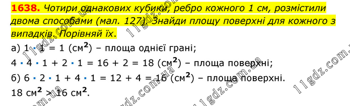 Чотири однакових кубики, ребро кожного 1 см, розмістили двома способами (мал. 127). Знайди площу поверхні для кожного з випадків. Порівняй їх. а) 1 ∙ 1 = 1 (см2) – площа однієї грані; 4 ∙ 4 ∙ 1 + 2 ∙ 1 = 16 + 2 = 18 (см2) – площа поверхні; б) 6 ∙ 2 ∙ 1 + 4 ∙ 1 = 12 + 4 = 16 (см2) – площа поверхні. 18 см2 > 16 см2.