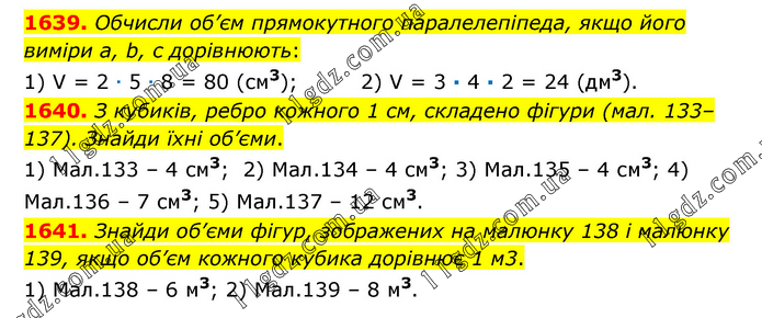 1639. Обчисли об’єм прямокутного паралелепіпеда, якщо його виміри а, b, с дорівнюють: 1) V = 2 ∙ 5 ∙ 8 = 80 (см3); 2) V = 3 ∙ 4 ∙ 2 = 24 (дм3). 1640. З кубиків, ребро кожного 1 см, складено фігури (мал. 133–137). Знайди їхні об’єми. 1) Мал.133 – 4 см3; 2) Мал.134 – 4 см3; 3) Мал.135 – 4 см3; 4) Мал.136 – 7 см3; 5) Мал.137 – 12 см3. 1641. Знайди об’єми фігур, зображених на малюнку 138 і малюнку 139, якщо об’єм кожного кубика дорівнює 1 м3. 1) Мал.138 – 6 м3; 2) Мал.139 – 8 м3.