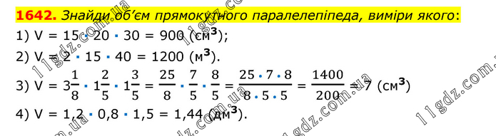 Знайди об’єм прямокутного паралелепіпеда, виміри якого: 1) V = 15 ∙ 20 ∙ 30 = 900 (см3); 2) V = 2 ∙ 15 ∙ 40 = 1200 (м3). 3) V = 31/8 ∙ 12/5 ∙ 13/5 = 25/8 ∙ 7/5 ∙ 8/5 = (25 • 7 • 8)/(8 • 5 • 5) = 1400/200 = 7 (см3) 4) V = 1,2 ∙ 0,8 ∙ 1,5 = 1,44 (дм3).