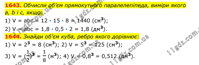 1643. Обчисли об’єм прямокутного паралелепіпеда, виміри якого а, b і с, якщо: 1) V = abc = 12 ∙ 15 ∙ 8 = 1440 (см3); 2) V = abc = 1,8 ∙ 0,5 ∙ 2 = 1,8 (дм3). 1644. Знайди об’єм куба, ребро якого дорівнює: 1) V = 23 = 8 (см3); 2) V = 53 = 125 (см3); 3) V = (1/2)3 = 1/8 (м3); 4) V = 0,83 = 0,512 (дм3).