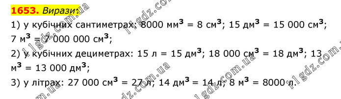 Вирази: 1) у кубічних сантиметрах: 8000 мм3 = 8 см3; 15 дм3 = 15 000 см3; 7 м3 = 7 000 000 см3; 2) у кубічних дециметрах: 15 л = 15 дм3; 18 000 см3 = 18 дм3; 13 м3 = 13 000 дм3; 3) у літрах: 27 000 см3 = 27 л; 14 дм3 = 14 л; 8 м3 = 8000 л.