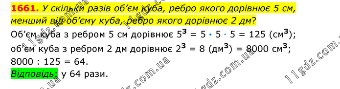 У скільки разів об’єм куба, ребро якого дорівнює 5 см, менший від об’єму куба, ребро якого дорівнює 2 дм? Об’єм куба з ребром 5 см дорівнює 53 = 5 ∙ 5 ∙ 5 = 125 (см3); об’єм куба з ребром 2 дм дорівнює 23 = 8 (дм3) = 8000 см3; 8000 : 125 = 64. Відповідь: у 64 рази.