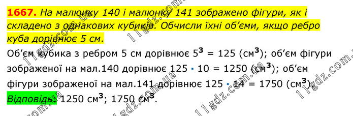 На малюнку 140 і малюнку 141 зображено фігури, як і складено з однакових кубиків. Обчисли їхні об’єми, якщо ребро куба дорівнює 5 см. Об’єм кубика з ребром 5 см дорівнює 53 = 125 (см3); об’єм фігури зображеної на мал.140 дорівнює 125 ∙ 10 = 1250 (см3); об’єм фігури зображеної на мал.141 дорівнює 125 ∙ 14 = 1750 (см3). Відповідь: 1250 см3; 1750 см3.