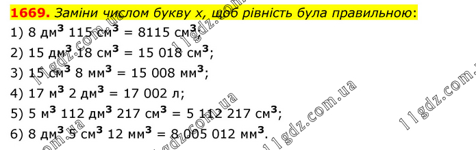 Заміни числом букву х, щоб рівність була правильною: 1) 8 дм3 115 см3 = 8115 см3; 2) 15 дм3 18 см3 = 15 018 см3; 3) 15 см3 8 мм3 = 15 008 мм3; 4) 17 м3 2 дм3 = 17 002 л; 5) 5 м3 112 дм3 217 см3 = 5 112 217 см3; 6) 8 дм3 5 см3 12 мм3 = 8 005 012 мм3.