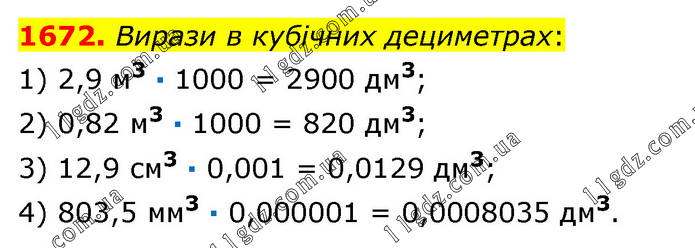 Вирази в кубічних дециметрах: 1) 2,9 м3 ∙ 1000 = 2900 дм3; 2) 0,82 м3 ∙ 1000 = 820 дм3; 3) 12,9 см3 ∙ 0,001 = 0,0129 дм3; 4) 803,5 мм3 ∙ 0,000001 = 0,0008035 дм3.