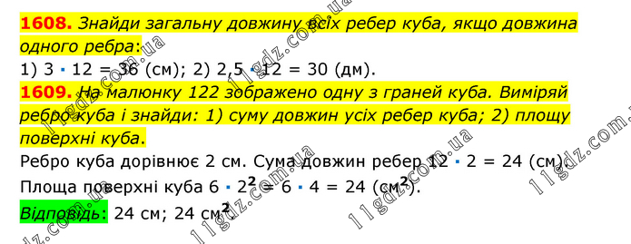 1608. Знайди загальну довжину всіх ребер куба, якщо довжина одного ребра: 1) 3 ∙ 12 = 36 (см); 2) 2,5 ∙ 12 = 30 (дм). 1609. На малюнку 122 зображено одну з граней куба. Виміряй ребро куба і знайди: 1) суму довжин усіх ребер куба; 2) площу поверхні куба. Ребро куба дорівнює 2 см. Сума довжин ребер 12 ∙ 2 = 24 (см). Площа поверхні куба 6 ∙ 22 = 6 ∙ 4 = 24 (см2). Відповідь: 24 см; 24 см2.