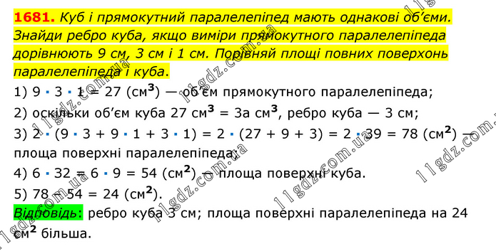 Куб і прямокутний паралелепіпед мають однакові об’єми. Знайди ребро куба, якщо виміри прямокутного паралелепіпеда дорівнюють 9 см, 3 см і 1 см. Порівняй площі повних поверхонь паралелепіпеда і куба. 1) 9 ∙ 3 ∙ 1 = 27 (см3) — об’єм прямокутного паралелепіпеда; 2) оскільки об’єм куба 27 см3 = 3а см3, ребро куба — 3 см; 3) 2 ∙ (9 ∙ 3 + 9 ∙ 1 + 3 ∙ 1) = 2 ∙ (27 + 9 + 3) = 2 ∙ 39 = 78 (см2) —площа поверхні паралелепіпеда; 4) 6 ∙ З2 = 6 ∙ 9 = 54 (см2) — площа поверхні куба. 5) 78 – 54 = 24 (см2). Відповідь: ребро куба 3 см; площа поверхні паралелепіпеда на 24 см2 більша.