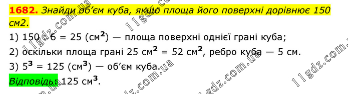 Знайди об’єм куба, якщо площа його поверхні дорівнює 150 см2. 1) 150 : 6 = 25 (см2) — площа поверхні однієї грані куба; 2) оскільки площа грані 25 см2 = 52 см2, ребро куба — 5 см. 3) 53 = 125 (см3) — об’єм куба. Відповідь: 125 см3.