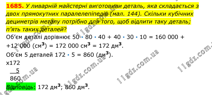 У ливарній майстерні виготовили деталь, яка складається з двох прямокутних паралелепіпедів (мал. 144). Скільки кубічних дециметрів металу потрібно для того, щоб відлити таку деталь; п’ять таких деталей? Об’єм деталі дорівнює 50 ∙ 80 ∙ 40 + 40 ∙ 30 ∙ 10 = 160 000 + +12 000 (см3) = 172 000 см3 = 172 дм3. Об’єм 5 деталей 172 ∙ 5 = 860 (дм3). Відповідь: 172 дм3; 860 дм3.